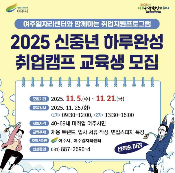 교육 참여 신청 기간은 11월 5일부터 11월 21일까지 여주일자리센터를 방문하면 된다.