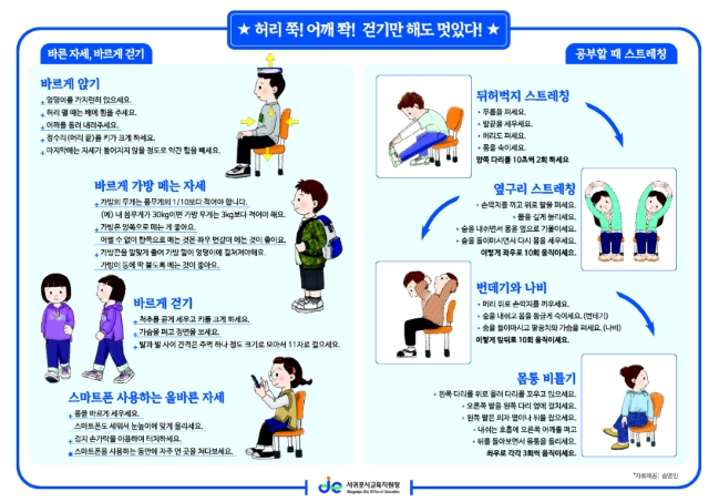 이번 교육은 1일부터 일상에서 올바른 자세에 대한 인식을 높이고 학교에서 익힌 건강 습관이 가정에서도 이어지도록 하여 생활 속 건강 문화 확산을 도모하는 데 목적이 있다.