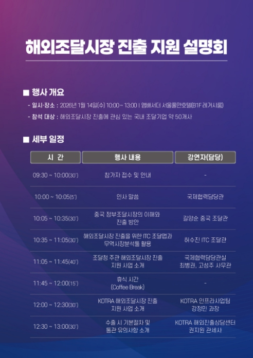 이번 설명회는 2025년 공공조달수출상담회(GPPM) 후속으로, 우리기업의 해외조달시장 진출을 장려하고 관련 지원사업의 정보를 제공하기 위해 진행됐다.