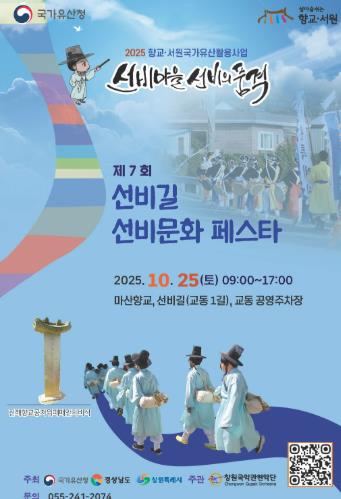 정양숙 문화관광체육국장은 “창원이 가진 국가유산과 전통의 의미와 매력을 쉽게 이해하고 체험할 수 있는 프로그램을 준비했다”며, “선선해지는 가을날 가족, 친구들과 함께 선비문화를 느껴볼 수 있는 좋은 기회가 되길 바란다”고 밝혔다.