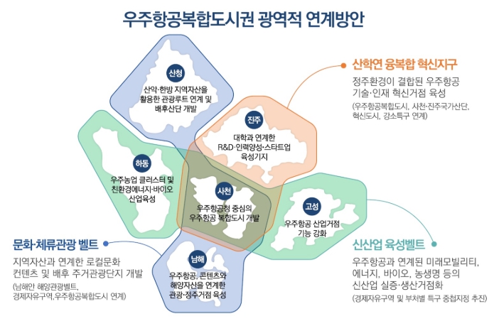 광역적 혁신생태계 구축을 위해 사천(위성, 제조), 진주(교육, 연구), 고성(무인기), 남해(UAM해양관광), 하동(우주농업), 산청(산악연계 우주항공테마관광), 창원(엔진,방산) 등 경남 전체를 우주항공 산업벨트로 형성하고, 전남 고흥(발사체, 실증), 대전(연구, 인재)을 넘어 세계 협력까지 아우르는 글로벌 슈퍼클러스터 육성 전략을 마련했다.