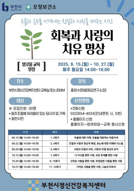 과정은 6주간 총 12회기로 운영되며, 음주나 우울 문제를 겪고 있는 시민은 물론 건강한 음주 문화에 관심 있는 누구나 참여할 수 있다. 신청은 9월 12일까지 선착순 30명을 대상으로 부천시정신건강복지센터 홈페이지 또는 전화로 접수한다.