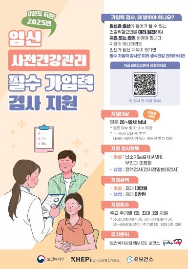 여성은 난소기능검사와 초음파 검사로 부인과 건강 상태를 확인하고, 남성은 정액 검사(정자 정밀 형태 검사 포함)를 통해 건강을 확인할 수 있으며, 해당 검사는 e-보건소 온라인 신청 또는 보건소 방문을 통해 신청 가능하다.