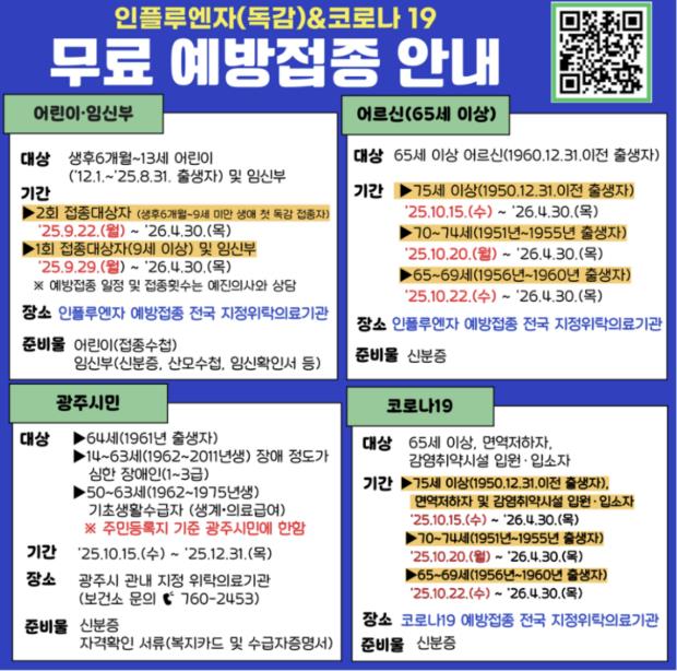 시는 국가 지원과 별도로 주소지를 광주시에 둔 ▲64세 시민 ▲14~63세 심한 장애인(1~3급) ▲50~63세 기초생활수급자(생계·의료급여 대상자)에게 10월 15일부터 12월 31일까지 무료 접종을 지원한다.