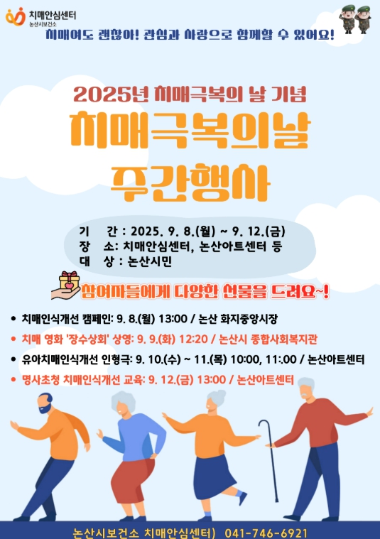 행사는 논산시민 누구나 참여할 수 있으며, △치매 인식 개선 캠페인(9월 8일, 화지중앙시장) △치매 영화 상영(9월 9일, 논산시 종합사회복지관) △유아 인형극(9월 10일~11일, 논산아트센터) △관계기관 종사자 교육(9월 12일, 논산아트센터) 등 다양한 프로그램으로 구성됐다.