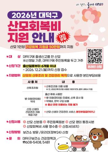 지원 대상은 대덕구에 출생신고를 하고 현재 대덕구에 주민등록을 둔 산모로, 출산일로부터 6개월 이내에 신청해야 한다.