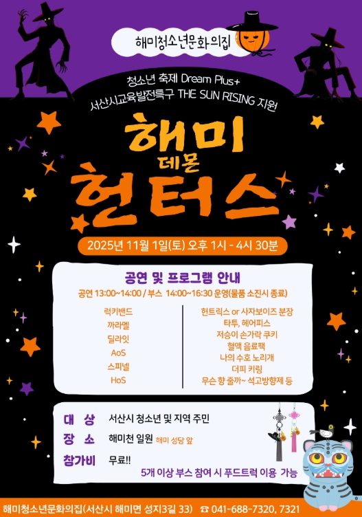 이번 축제는 서산시교육발전특구 THE SUN RISING 사업의 지원을 받아 청소년들이 직접 기획하고 운영하는 참여형 행사로, 한국형 핼러윈 콘셉트를 통해 청소년들이 자율성과 창의성을 발휘하며 즐길 수 있는 문화 콘텐츠로 구성된다.