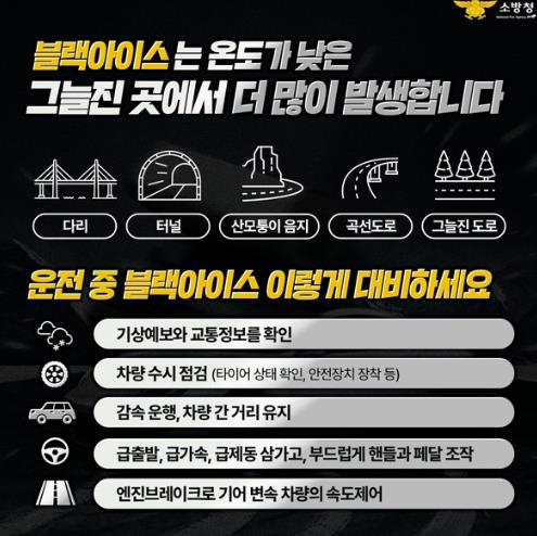 소방서는 블랙아이스로 인한 사고 예방을 위해 △감속 운행 및 안전거리 확보 △급가속·급제동·급조향 금지 △눈길·빙판길에서는 엔진브레이크 활용 △기상예보와 교통정보 확인 등을 당부했다.