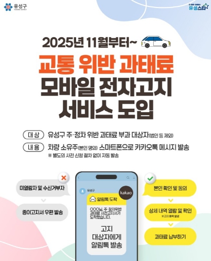 기존 과태료 고지서는 등기우편으로 발송해 부재중 미수령 사례가 잦았고, 인쇄·우편비용 부담은 물론 종이 사용에 따른 환경적 부담도 컸다.