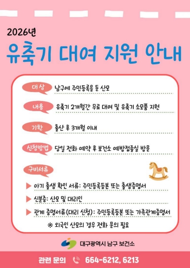 이에 남구보건소는 2026년 1월부터 남구에 주민등록을 둔 산모를 대상으로 유축기 무료 대여 지원사업을 실시한다. 산모 1인당 유축기를 2개월간 무료로 대여하며, 대여 시 유축기 소모품도 함께 지원할 예정이다.