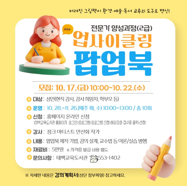 참여 신청은 10월 17일 오전 10시부터 10월 22일 오후 6시까지 태백교육도서관 누리집을 통해 온라인 선착순 접수로 진행된다.