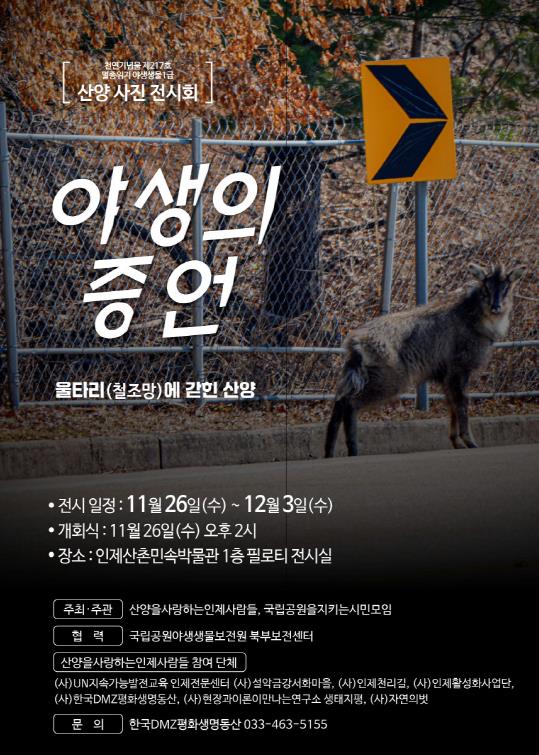 이번 전시는 지난 10월 16~17일 국회에서 열린 산양 사진전 ‘야생의 증언’의 후속 사진전으로, 당시 전시한 작품 외에도 인제 주민들이 산양 보호 활동 과정에서 촬영한 사진과 국립공원야생생물보전원 북부보전센터의 사진을 추가로 선보일 예정이다.
