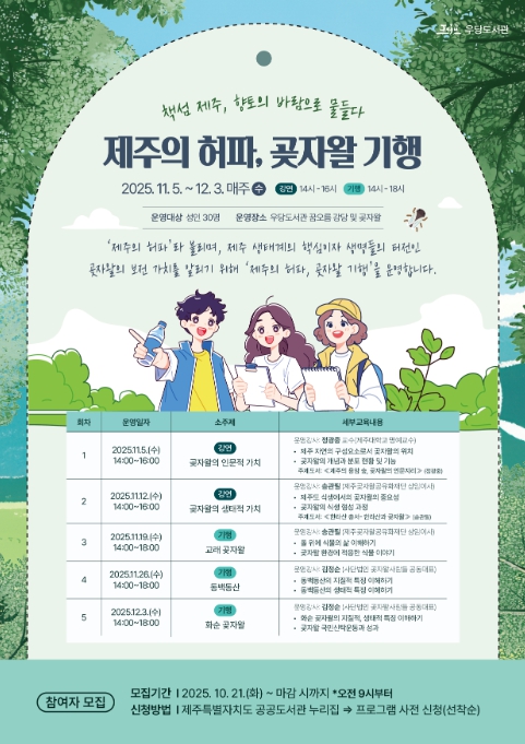 프로그램 참여를 원하는 제주 시민은 10월 21일부터 제주특별자치도 공공도서관 누리집을 통해 선착순 접수하면 된다.