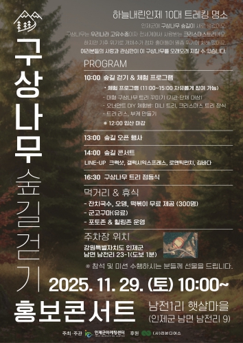 군 관계자는 “구상나무의 생태적 가치와 보전 필요성을 널리 알리는 동시에, 구상나무 숲길이 인제군을 대표하는 관광 자원으로 자리매김하도록 지속적으로 노력하겠다”고 밝혔다.