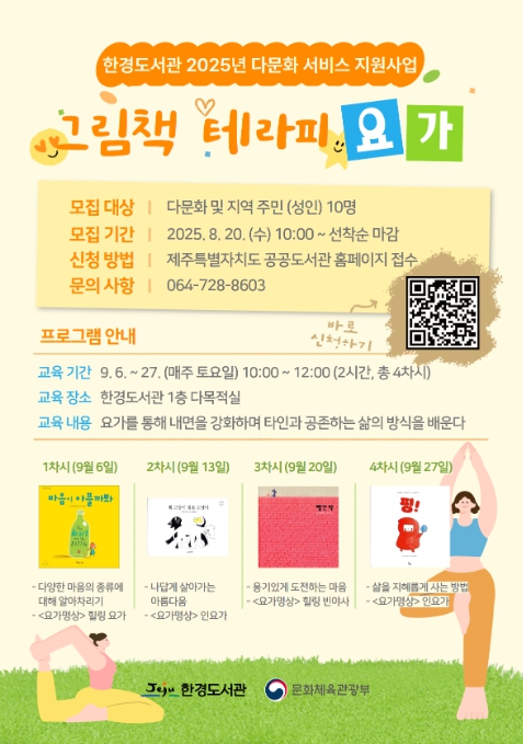 김봉석 탐라도서관장은 “테마별 그림책 감상을 통해 자신의 내면을 돌아보고, 삶을 유연하게 살아갈 수 있는 마음의 근육을 키우는 시간이 되길 바란다”며, “지역 주민들의 많은 관심과 참여를 부탁드린다”고 말했다.
