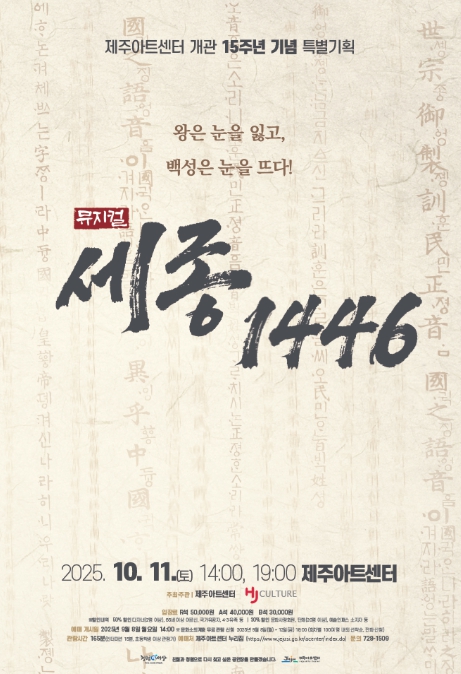 제주시 관계자는 “제주아트센터가 시민과 함께한 15년을 기념해 세종대왕의 숭고한 정신을 무대에서 되살리고자 이번 공연을 준비했다”며 “앞으로도 시민의 기대에 부응하는 수준 높은 공연으로 지역 문화예술 발전에 기여하겠다”고 말했다.