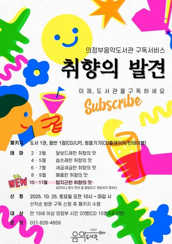 텁지근한 취향의 맛 구독 신청은 10월 25일 오전 10시부터 음악도서관을 방문해 선착순으로 가능하며, 자세한 내용은 음악도서관 누리집 또는 전화를 통해 확인할 수 있다.