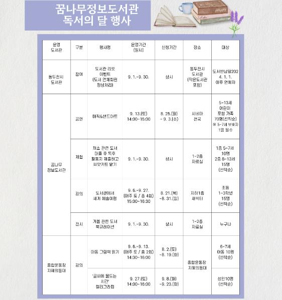 도서관 관계자는 “9월 20일 오르빛도서관에서 책문화축제가 열리고, 종합운동장 지혜의 등대에서도 캘리그라피 등 다채로운 프로그램이 진행될 예정이니 많은 참여를 바란다”라고 전했다.