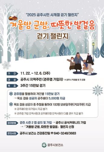 참여 방법은 ①스마트폰에서 ‘걷쥬 시즌2’ 앱을 내려받아 회원가입을 하고 ②공주시 공식 커뮤니티에 가입한 뒤 ③‘겨울밤 군밤, 따뜻한 발걸음’ 챌린지에 신청하고 ④스마트폰을 지닌 채 15만 보 이상 걷기를 실천하면 된다.