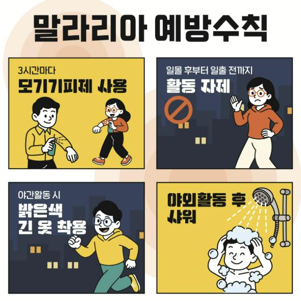 시는 말라리아 예방을 위해 △4월부터 10월까지는 야간(일몰 직후부터 일출 직전까지) 야외활동을 가급적 자제할 것 △야간 외출 시 밝은 색의 긴 소매와 긴 바지를 착용하고, 얼굴 주변에 모기 기피제를 사용할 것 △실내에서는 방충망을 정비하고 모기장을 사용하며, 실내 살충제를 사용할 것 △말라리아 위험지역 방문, 군 복무, 여행 후 오한·고열·발한이 48시간 주기로 반복되거나 두통, 구토, 설사 등의 증상이 나타날 경우 즉시 의료기관을 방문해 진료받을 것 등을 시민들에게 권고했다.