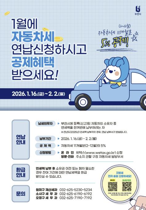 신청 대상은 1월 1일 기준 부천시에 등록된 자동차 소유자다. 연납을 희망하는 시민은 1월 16일부터 2월 2일까지 위택스를 이용하거나, 관할 구청 자동차세팀으로 전화 또는 방문해 신청하고 납부할 수 있다.