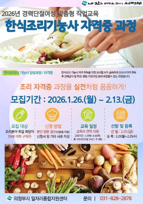 이부근 일자리경제과장은 “한식조리기능사 과정은 전문 자격 취득을 통해 취업으로 연계될 수 있는 대표적인 직업교육 과정”이라며 “앞으로도 구직자 중심의 맞춤형 직업교육을 운영해 구직자들의 취업 기회를 확대하겠다”고 말했다.