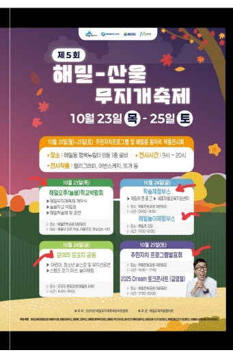 24일에는 학생·학부모·협동조합·주민이 함께 운영하는 50여 개 체험부스와 마을 사진전이 예정되어 있으며, 마지막 날인 25일에는 해밀동 행정복지센터 주민자치공연으로 축제의 막을 내릴 예정이다.
