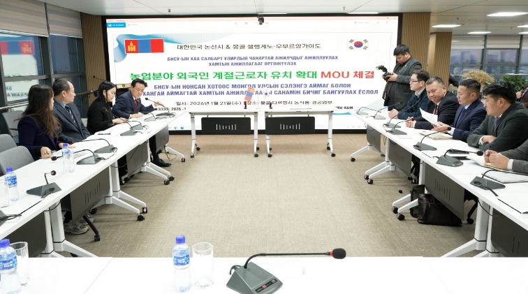 논산시(시장 백성현)는 21일 몽골 다르항시 농식품·경공업부에서 셀렝게도 및 우브르항가이도와 ‘농업분야 외국인 계절근로자 유치 확대를 위한 업무협약(MOU)’을 체결했다.