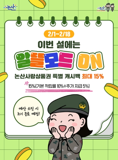 시 관계자는 “설 명절을 맞아 시민들에게는 실질적인 소비 혜택을 제공하고 지역 상권에는 매출 회복의 계기가 될 것으로 기대된다”며 “앞으로도 시기별 예산과 수요를 고려해 논산사랑상품권 적립금(캐시백) 지원을 탄력적으로 운영하여 지속적으로 지역경제에 활력을 불어넣겠다”고 밝혔다.