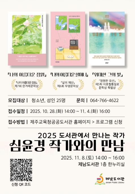 도서관 관계자는 “심윤경 작가의 작품에는 세대를 초월한 따뜻한 시선이 담겨 있다”라며 “이번 강연을 통해 가족 간의 소통과 사랑을 다시 생각해보는 계기가 되길 바란다”라고 말했다.