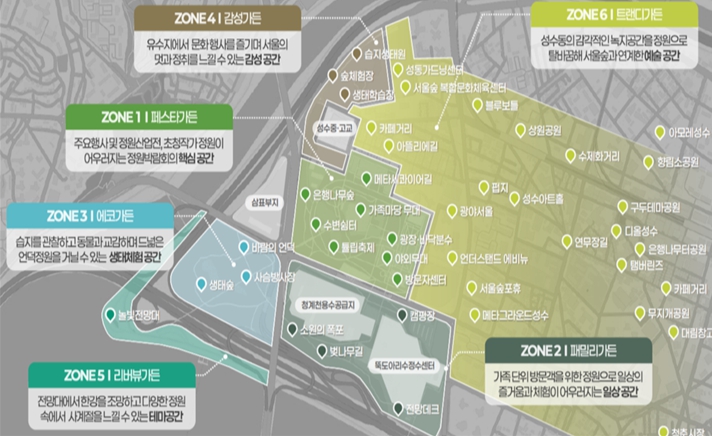 서울숲 인근 성수동 일대의 골목과 자투리땅 등에도 도심형 정원을 조성하고 한강·중랑천 수변 공간까지 범위를 연장해 계절별 매력적인 경관도 조성한다. ‘서울숲’의 자연과 ‘성수동’의 문화에너지, ‘수변’의 여가를 결합한 서울만이 선보일 수 있는 ‘정원 미학’을 구현한다는 취지다.
