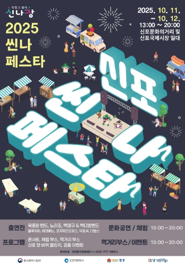 먼저, ‘씬나 페스타 in 신포’는 오는 10월 11~12일 신포문화의거리와 신포국제시장 일대에서 진행된다. 특히 노라조, 육중완 밴드, 백영규 등 인기 뮤지션들이 무대에 올라 화려한 콘서트와 버스킹을 선보인다.