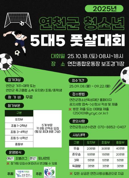 모집기간은 9월 8일부터 9월 22일까지이며 참가비는 무료이다. 신청서 제출방법과 세부 대회 안내는 (재)연천군청소년육성재단 홈페이지 공지사항에 게시되어 있다. 우승팀에게는 트로피·메달 및 상금을 수여하며, 본 경기뿐만 아니라 경기를 보러 온 모든 분들이 함께 참여할 수 있는 이벤트도 진행할 예정이다.