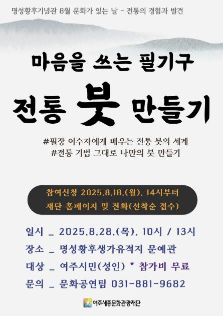 이순열 여주세종문화관광재단 이사장은 “붓은 수백 년간 우리나라의 역사를기록한 필기구이자 예술을 창작한 화구이다.”라며 “이번 8월 문화가 있는 날을 함께하며 붓에 담긴 전통문화를 새롭게 발견하는 시간이 되기를 바란다.”고 밝혔다.