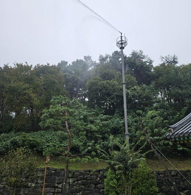 봉녕사 산불소화시설은 19m 높이의 수관수막타워 2기와 40톤 물탱크, 엔진펌프로 구성돼 있으며, 산불 발생 즉시 수막을 형성해 불길 확산을 차단하고 속도전이 관건인 초기 진화에 즉각 대응할 수 있도록 설계됐다. 이번 시운전에서는 장비 작동, 살포 압력, 분사 시간 등을 점검했으며 모두 정상 작동이 확인됐다.