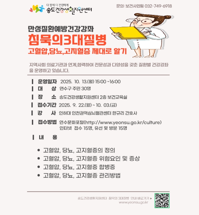 강좌는 건강에 관심 있는 연수구민 누구나 무료로 참여할 수 있으며, 10월 3일까지 연수문화포털 또는 전화로 선착순 신청할 수 있다.