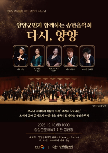 양양문화재단 관계자는 “올 한 해 열심히 살아오신 군민 여러분께 감사와 응원의 마음을 전하고자 음악회를 마련했다”며 “이번 공연을 통해 위로와 행복의 시간이 되시길 바란다”고 밝혔다.