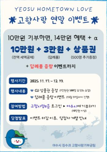 여수시 관계자는 “10만 원을 기부하면 최대 14만 원 이상의 혜택을 받을 수 있는 만큼 이번 연말 이벤트가 기부 참여를 유도하고 지역경제에도 활력을 불어넣는 계기가 되기를 바란다”고 말했다.