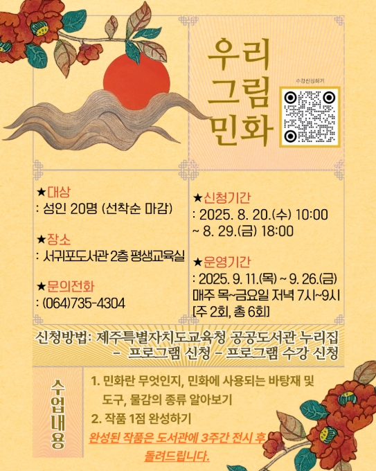 전통 민화 기법과 상징을 직접 배우고 그린다‘우리 그림 민화’ 강좌 포스터[시티트리뷴] 제주도교육청 서귀포도서관은 9월 11일부터 26일까지 민화의 전통적 의미를 이해하고 우리 문화의 아름다움과 가치를 지역 주민과 함께 나누기 위해 ‘우리 그림 민화’ 강좌 참여자를 선착순 모집한다.