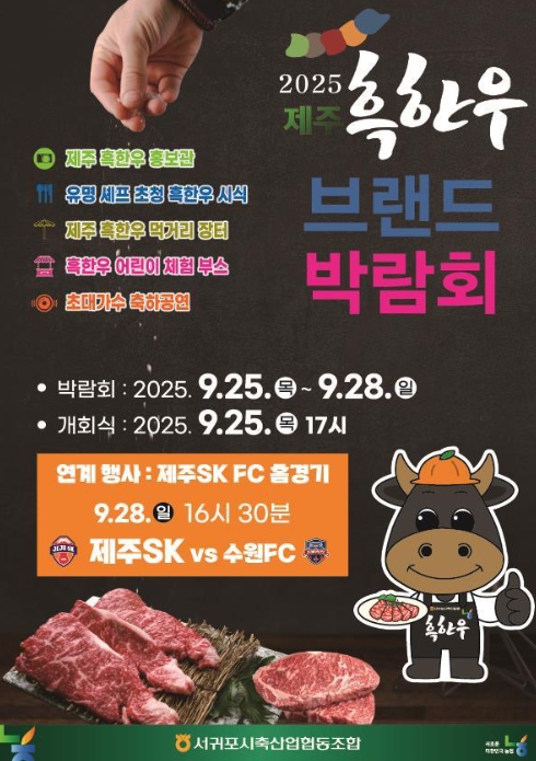특히 행사 마지막 날인 9월 28일에는 제주월드컵경기장에서 열리는 K리그1 제주-수원 경기와 연계한 특별 이벤트가 준비되어, 행사장에서 흑한우를 구매한 고객에게는 경기 입장권 할인 혜택과 함께 경품 추첨이벤트 등이 펼쳐지며 박람회의 대미를 장식한다.