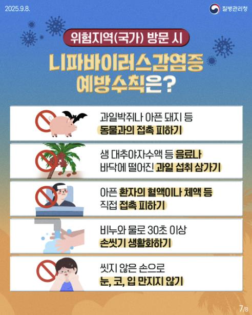 니파바이러스감염증은 1998년 말레이시아에서 처음 보고된 인수공통감염병으로, 감염된 동물(박쥐, 돼지 등)과의 접촉, 오염된 식품 섭취, 환자의 체액과 밀접 접촉을 통해 사람 간 전파가 가능하다. 인체 감염 시 40~75%에 이르는 높은 치명률을 보이는 중증 급성감염병으로, 현재 인도와 방글라데시 등에서 산발적으로 발생하고 있다.
