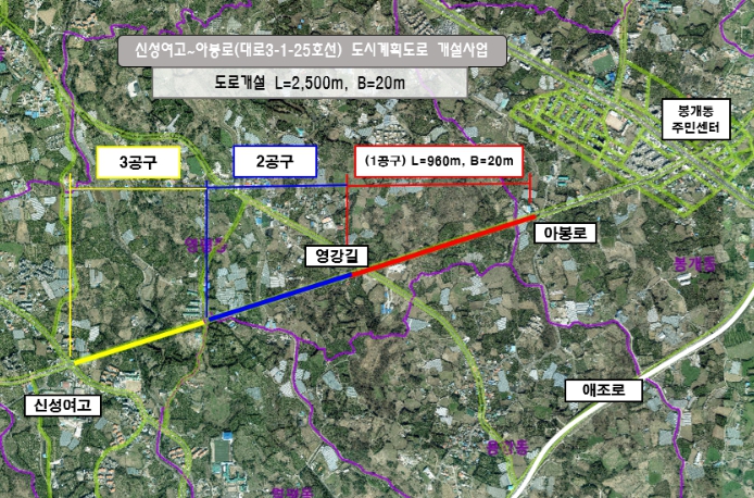 이번 사업은 신성여자고등학교 앞 교차로와 봉개동 LH아파트 북측을 연결하는 연장 2.5km, 폭 25m의 왕복 4차선 도로를 개설하는 사업이다.