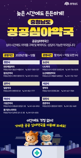도내 공공심야약국은 이번에 신규 지정된 공주시 1곳을 포함해 천안 2곳, 아산 2곳, 서산 1곳, 논산 2곳, 당진 1곳 등 총 9곳으로 늘었다.