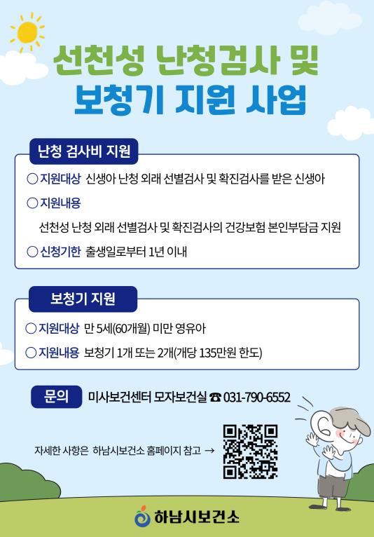 하남시는 이에 발맞춰 ▲건강보험이 적용된 신생아 난청 외래 선별검사비의 본인부담금(최대 2회) ▲재검 판정을 받은 아동의 확진검사비 본인부담금(최대 7만 원)을 지원한다. 신청은 출생일로부터 1년 이내 가능하다.