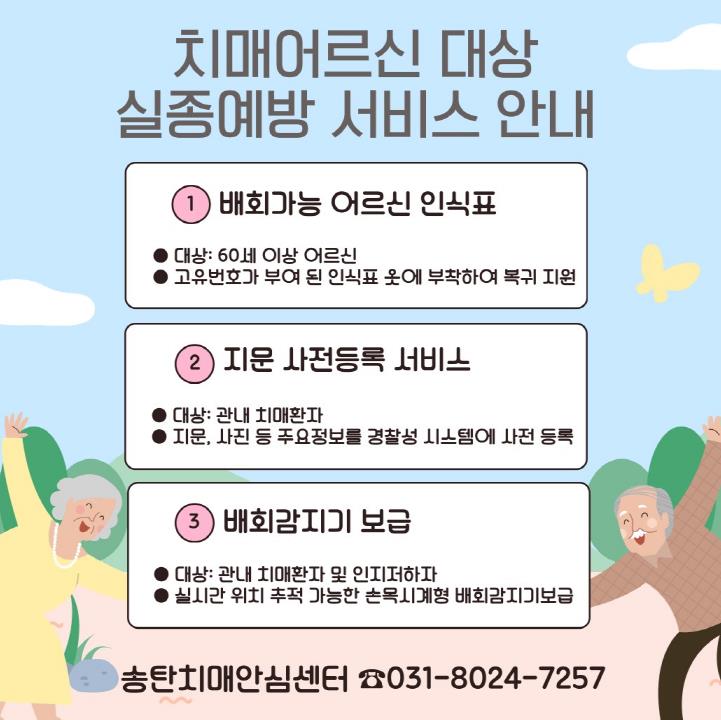 주요 사업으로는 배회 가능 어르신 인식표 보급, 지문 사전 등록제 운영, 위치 확인 시스템(배회감지기) 지원 등이 있다.