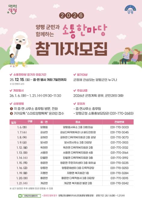 한편, ‘2026년 군민과 함께하는 소통한마당’은 △6일 양평읍 △7일 강상면 △8일 강하면 △9일 양서면 △12일 옥천면 △13일 서종면 △14일 단월면 △15일 청운면 △16일 양동면 △19일 지평면 △20일 용문면 △21일 개군면 순으로 개최된다.