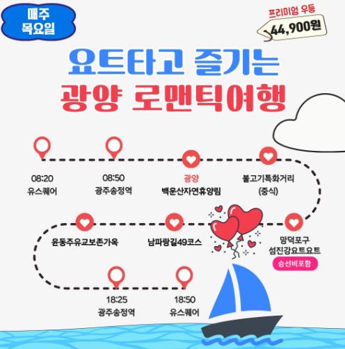 투어 일정은 ▲유스퀘어(8:20) ▲송정역(8:50) ▲백운산자연휴양림 ▲불고기특화거리 ▲망덕포구 요트 체험 ▲남파랑길 49코스 ▲윤동주 유고 보존 가옥을 거쳐 ▲송정역(18:25) ▲유스퀘어(18:50)로 돌아오는 코스다.