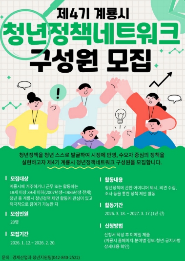 모집 대상은 계룡시에 거주하거나 근무, 활동하는 만 18세 이상 39세 이하 청년으로, 선발된 구성원은 정책 아이디어 제시, 의견 수집 및 조사를 통해 실질적인 정책 제안에 참여한다.