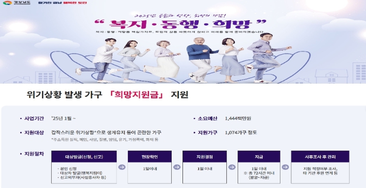 희망지원금은 복지·동행·희망 경남 도정 실현을 위해 올해부터 시행하는 핵심 정책으로서, 정부형 긴급복지 등 현행 법·제도에서 제외된 저소득 가구 중 위기상황에 처한 가구에 생계비, 의료비 등을 지원하는 경남형 긴급복지 제도이다.