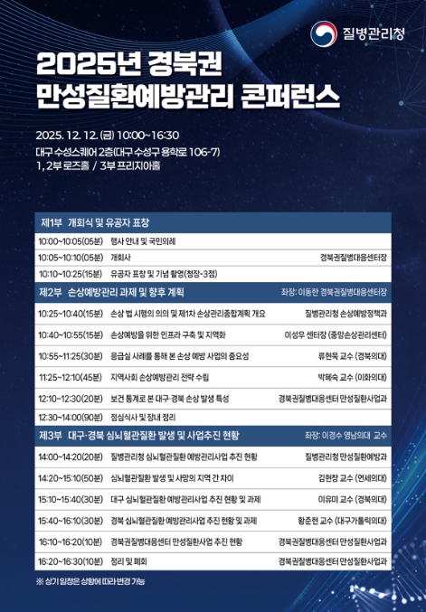 제1부 개회식에서는 경북권 만성질환 예방관리에 기여한 유공자에게 질병관리청장상을 수여하고, 제2부에서는 손상예방관리 과제 및 향후 계획을 주제로, 손상관리정책에서 국가와 전문기관의 역할, 지자체 손상관리계획 수립 전략에 대해 정부와 전문가 발표를 이어간다. 제3부에서는 국가와 지자체 심뇌혈관질환 예방관리사업 현황을 공유하고, 심뇌혈관질환 발생 및 사망의 지역 간 차이에 대한 전문가 발표를 진행한다.
